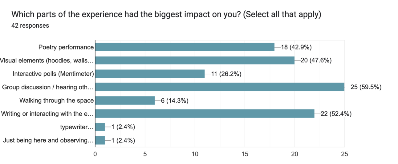Taken altogether, the CAPA Versescape not only engaged students but also encouraged critical thinking, creative risk-taking, and fostered reflection on their own work. The combination of performance, interactive installation components, and peer discussion created a measurable impact on students’ engagement with poetry.